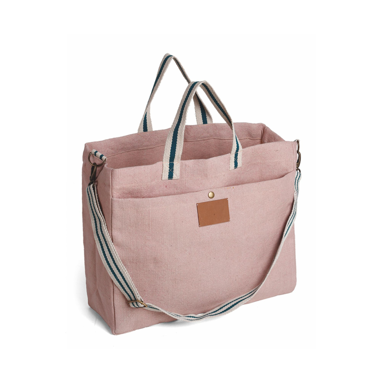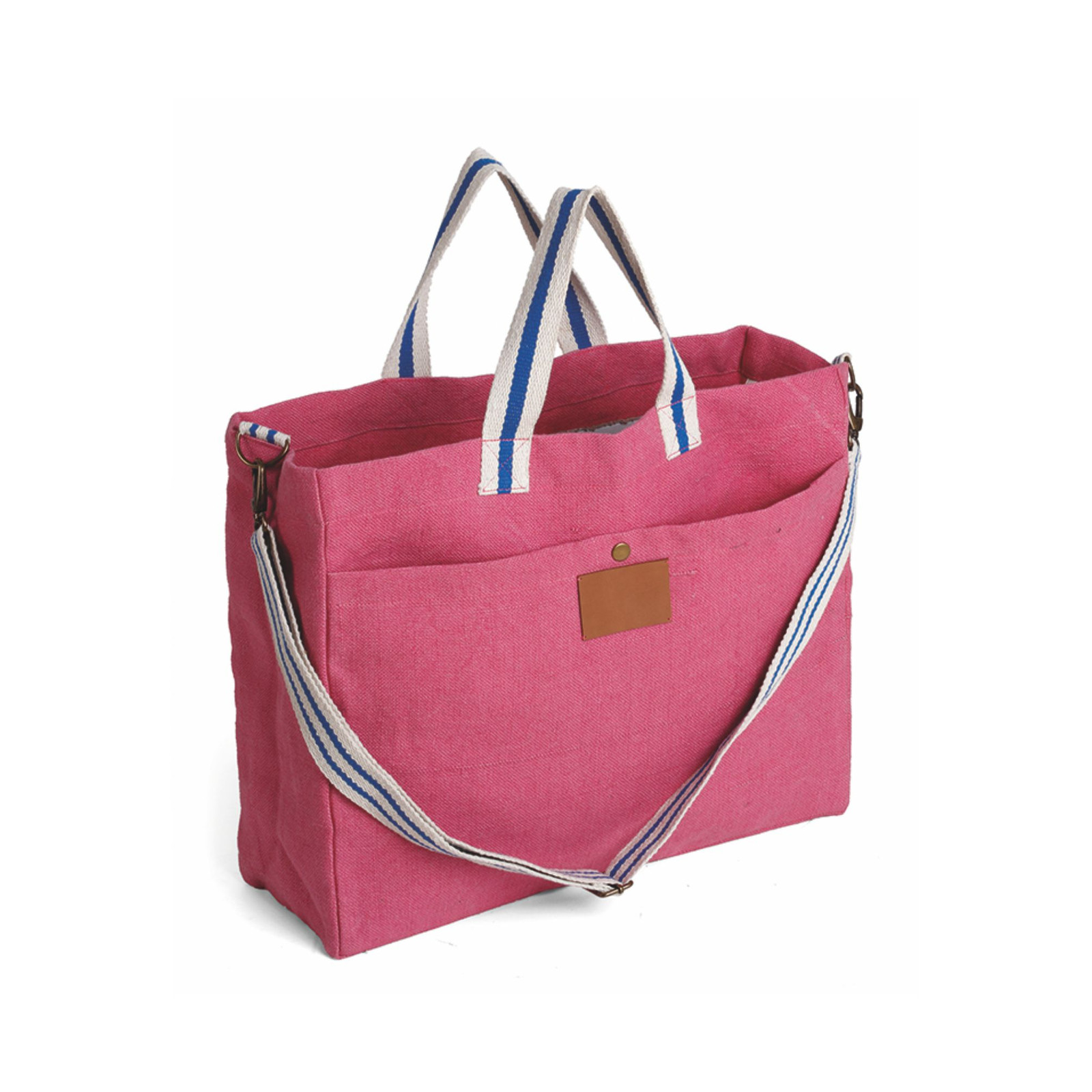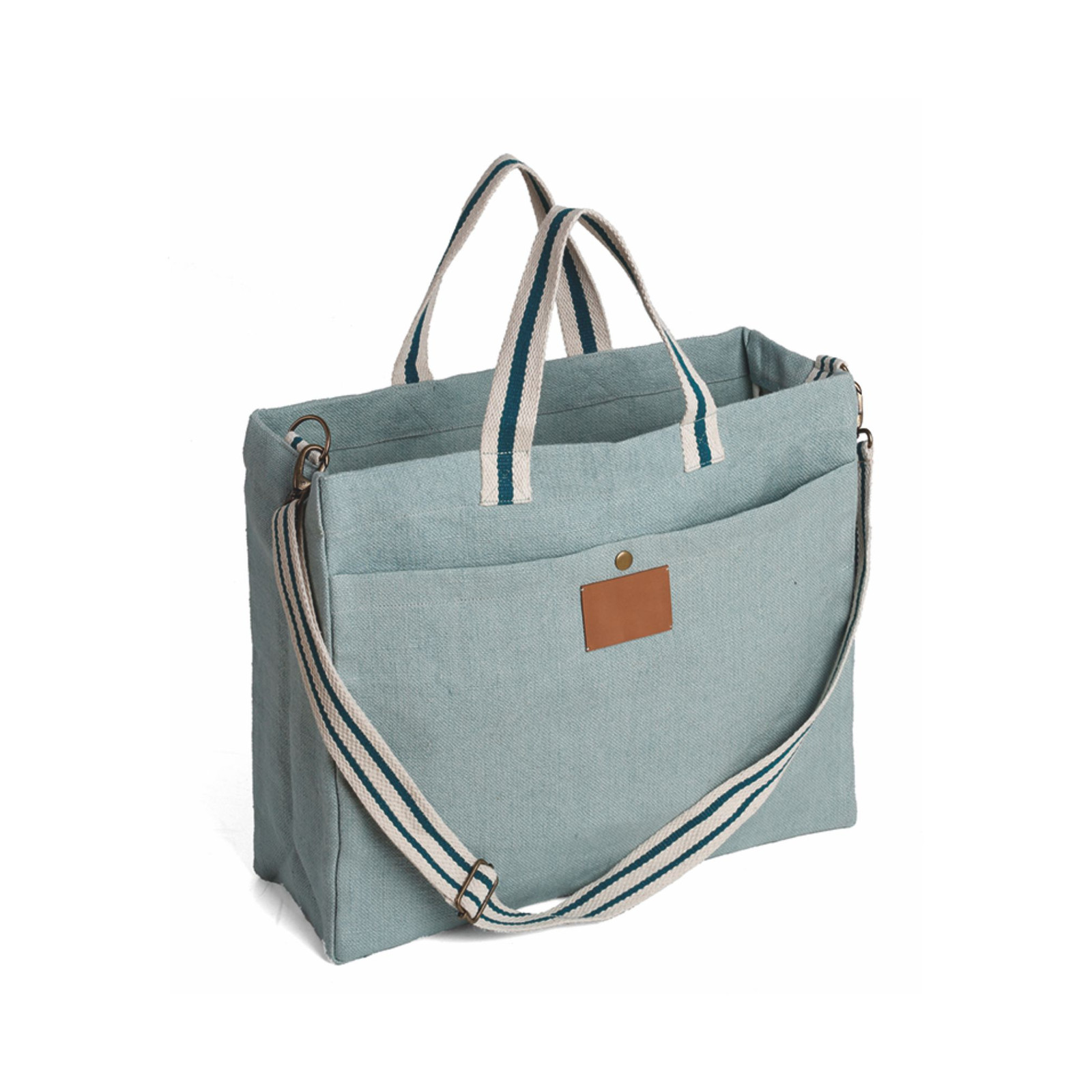 Borsa in soft juta e cotone, tasca frontale, manici in corda cm 4x48, tracolla regolabile cm 4x132. Dimensioni: cm 46x39x15. Imballo: 10pz.