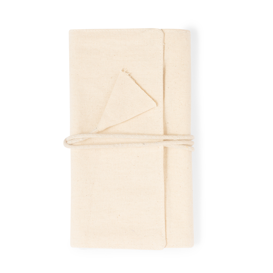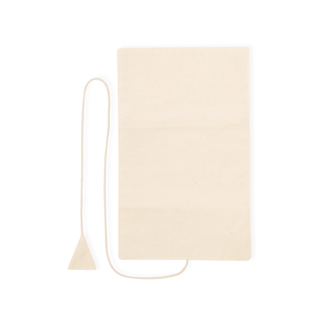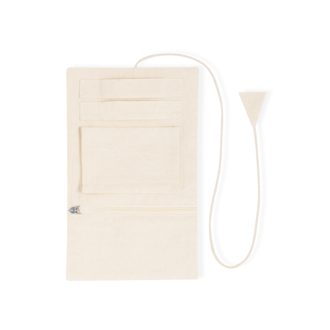 Portagioie pieghevole in cotone, per riporre preziosi oggetti personali. Realizzato in 3 parti di colore naturale: parte superiore con nastri, parte centrale con tasca e parte inferiore con tasca con cerniera. Può essere piegato e tenuto fermo con il cordoncino coordinato.