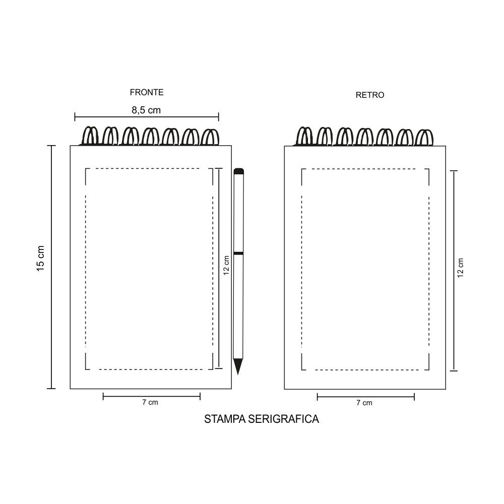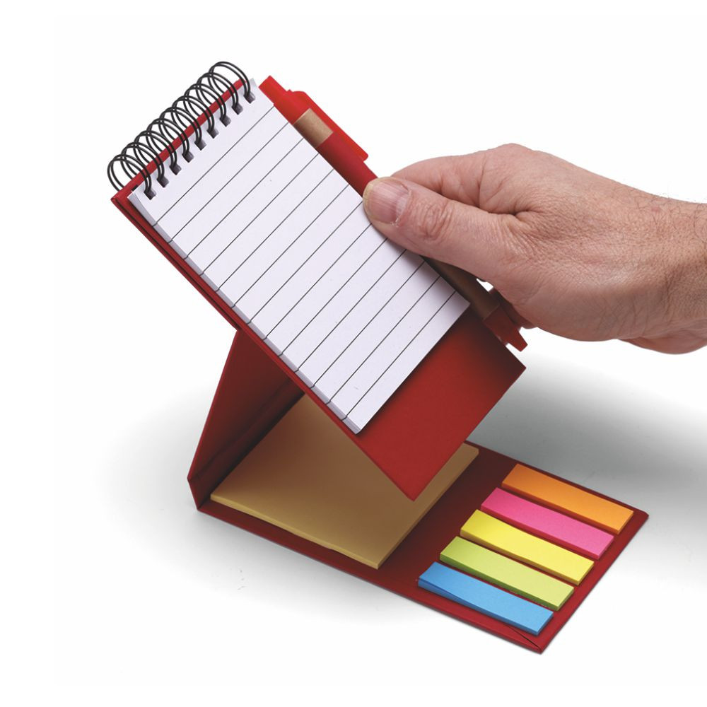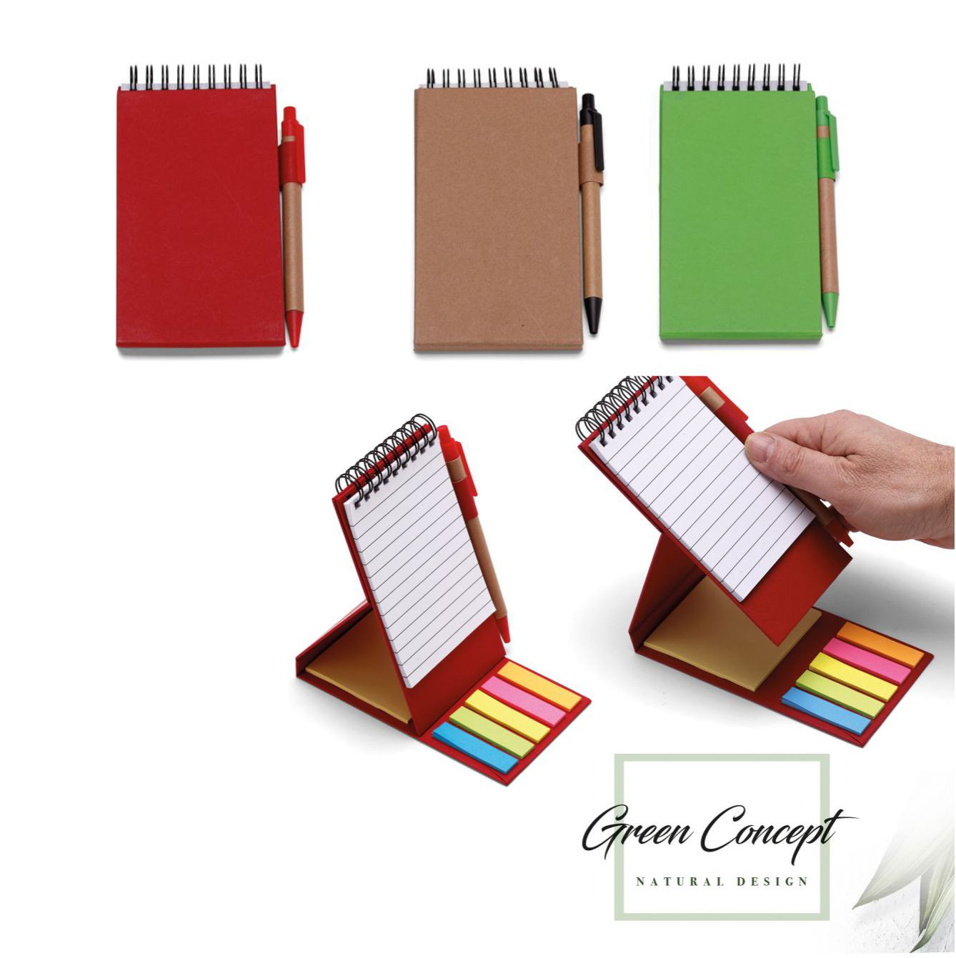 Blocco notes “Eco paper”. Carta 70gr. 70 fogli a righe. Corredato di: 25 post-it per colore, pen-na refill nero. Colori: rosso, avana, verde, blu. Confezione in polybag. . Dimensioni cm. 8,5x15 Imballo: 100xcolore