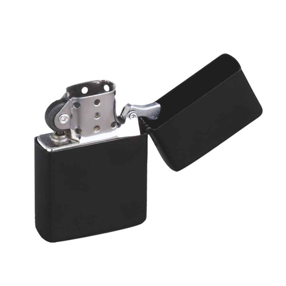 Accendino ricaricabile in metallo. Colori: nero, silver. Confezione in astuccio. Dimensioni cm.3,6x5,6x1,2. Imballo: 360xcolore