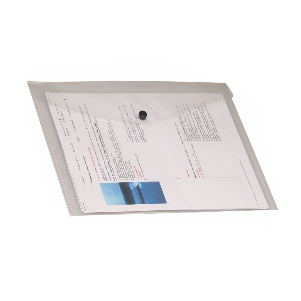 Busta portadocumenti in pvc trasparente. Chiusura con bottone. Colori: sky, verde, bianco, arancio, rosso. Confezione da 20pz. in polybag. Dimensioni cm 33,5x24 Imballo: 200xcolore