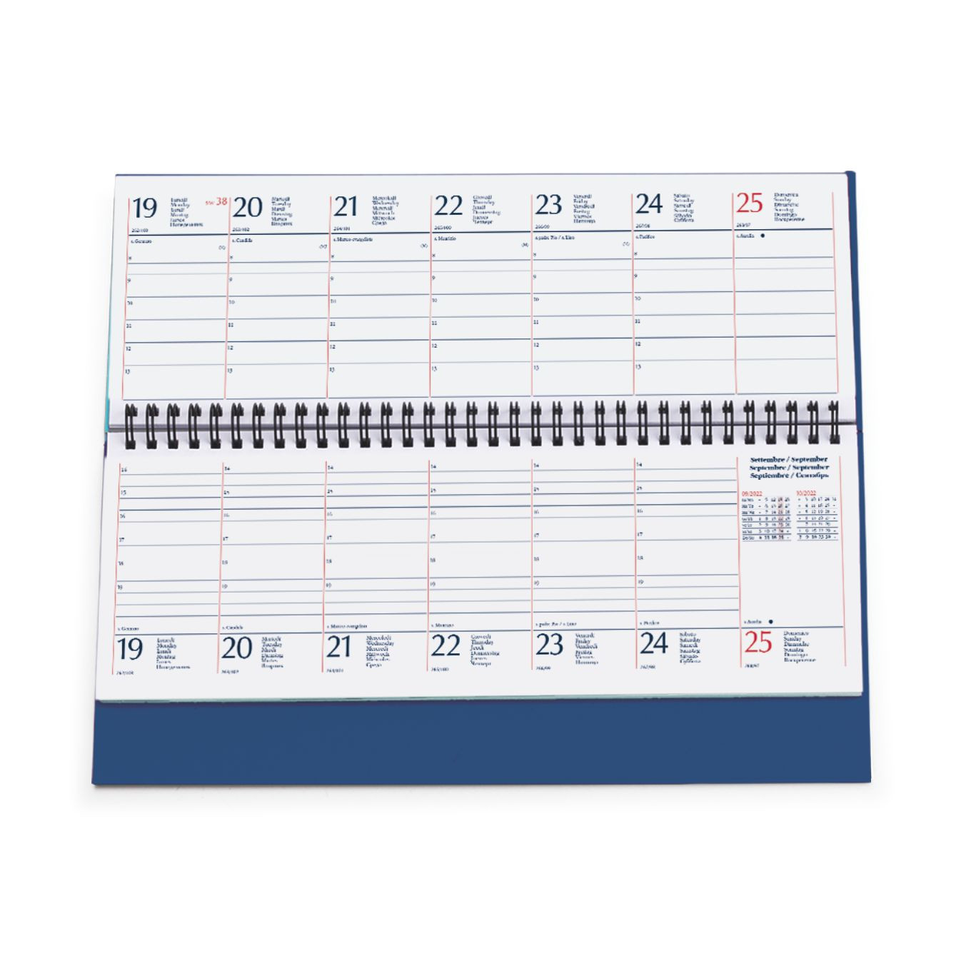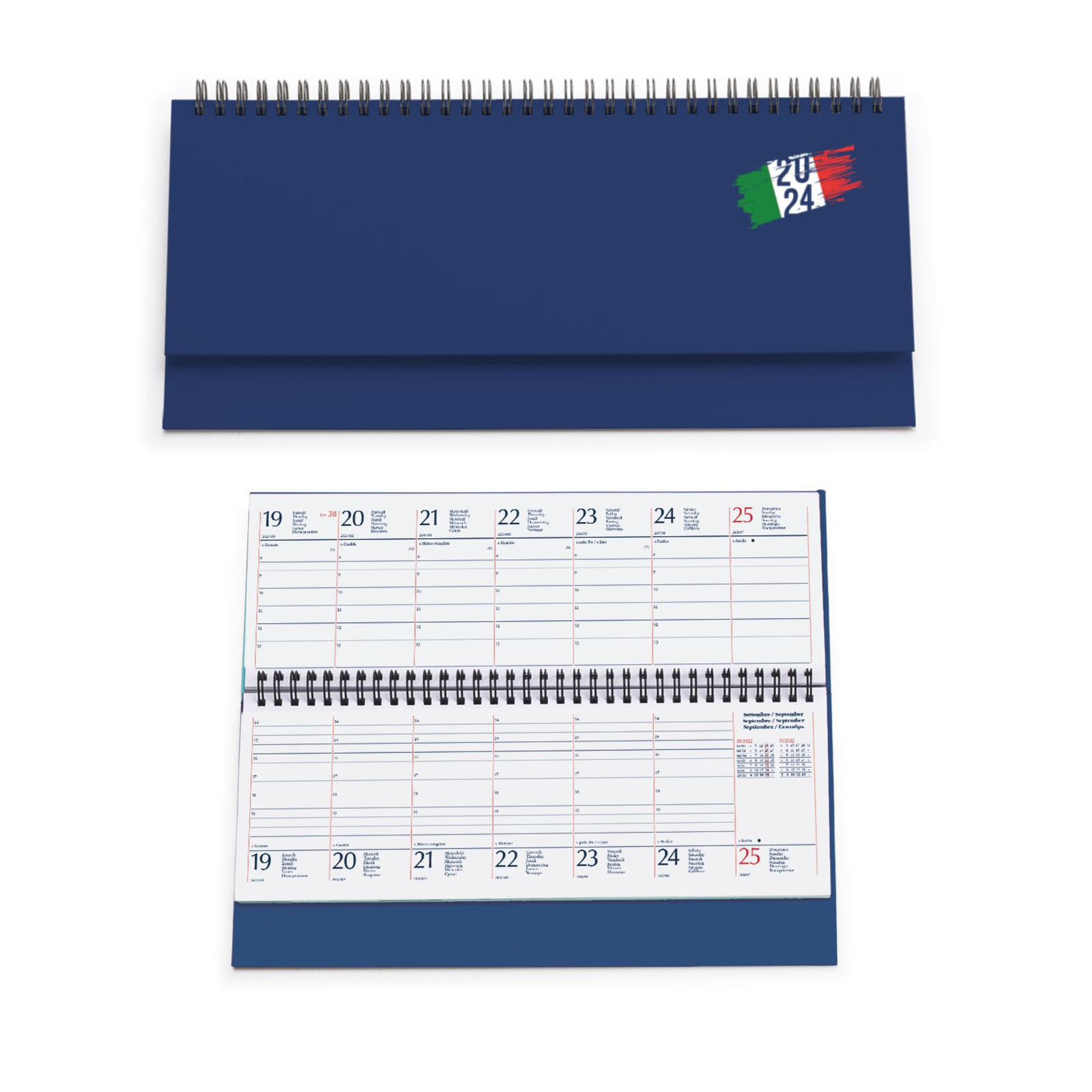 Planning spiralato “Italia”in matra. 128 pagine. Carta usomano bianca 70 gr. Interno stampa 2 colori, datato. Dimensioni cm 30x15 Imballo: 20