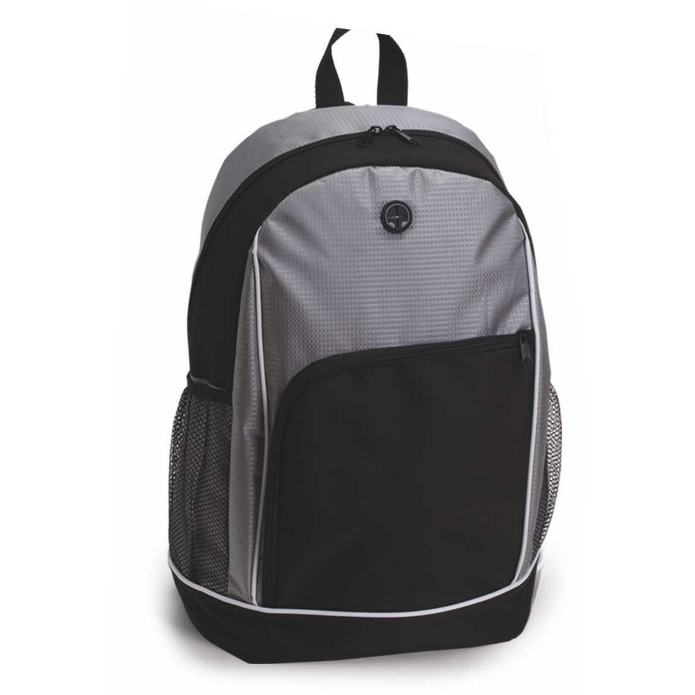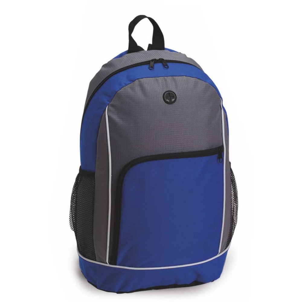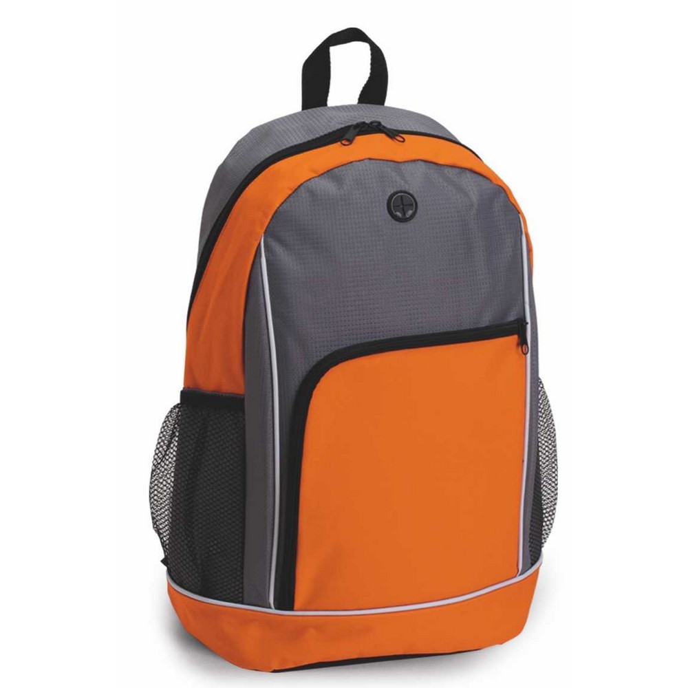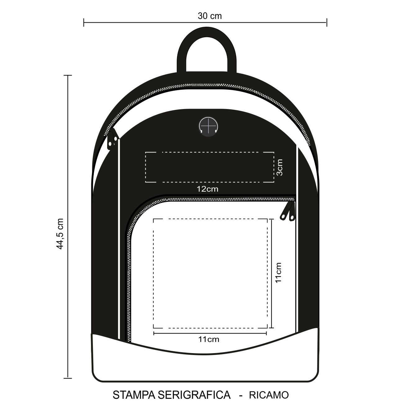 Zaino in poliestere 600D e jaquard. Chiusura doppio cursore, uscita auricolari. Spallacci imbottiti e regolabili. Taschini laterali elasticizzati in rete mesh. Tasca anteriore chiusa da zip. Colori: ros-so, arancio, blu, royal, nero, verde. Confezione in polybag. Dimensioni cm. 30x17,5x44,5 Imballo: 40xcolore