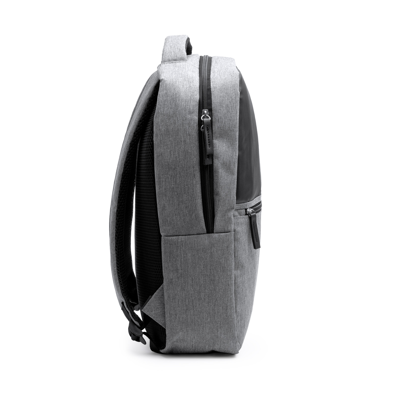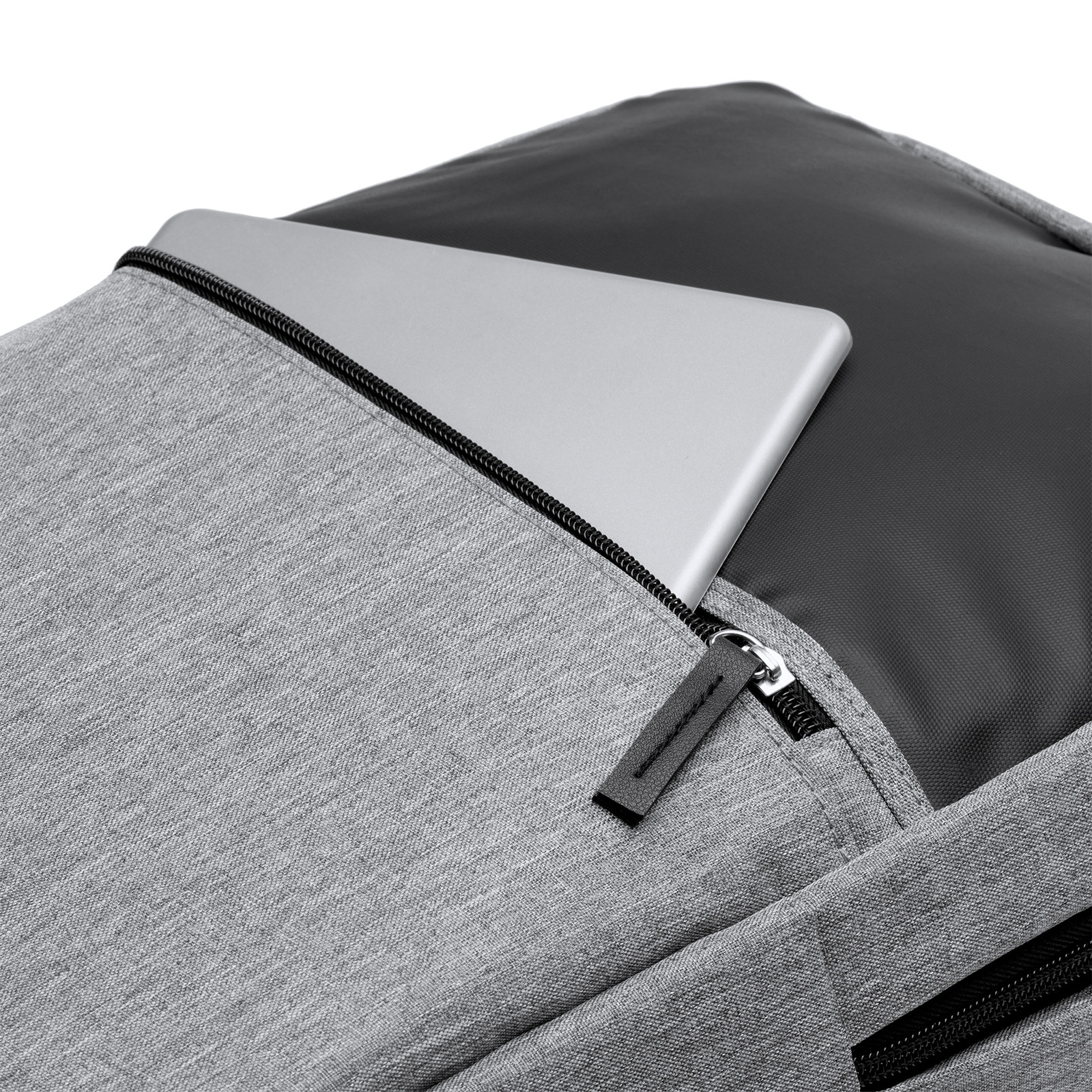 Zaino in poliestere RPET 600D con dettagli in pelle PU e mélange. Ampio scomparto principale e tasca imbottita per computer portatile da 15”. Tasca esterna imbottita. Spallacci e schienale imbottiti. Cinghia per trolley. Dimensioni: cm 30x43x12