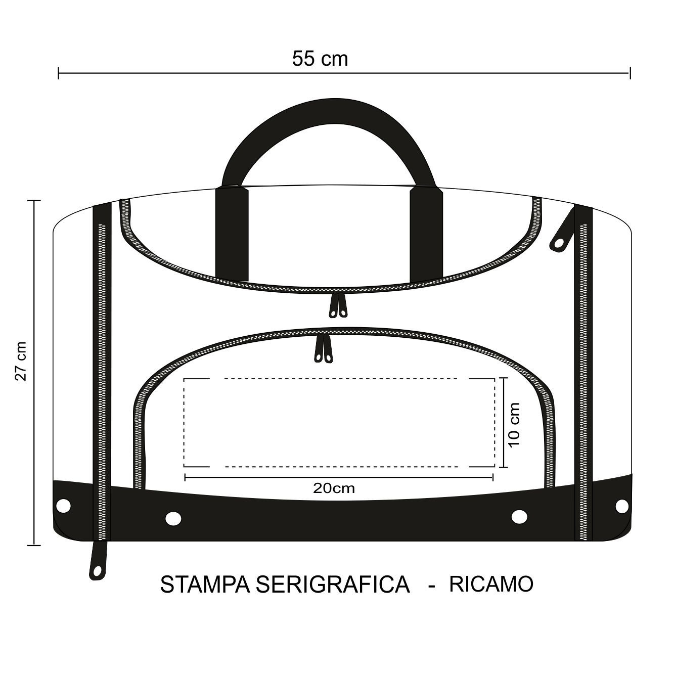 Borsone palestra in poliestere 600D. Chiuso con zip doppio cursore. Doppio manico con im-pugnatura imbottita chiuso da velcro. Tasca anteriore con zip, doppio cursore. Tasche entrambi i lati con zip. Tasca laterale elasticizzata. Completo di tracolla removibile, regolabile, salva spal-le. Piedini antiscivolo in plastica. Colori: rosso, nero, royal, fuxia, verde lime, arancio. Confe-zione in polybag. Dimensioni cm. 27x55x25 Imballo: 20xcolore