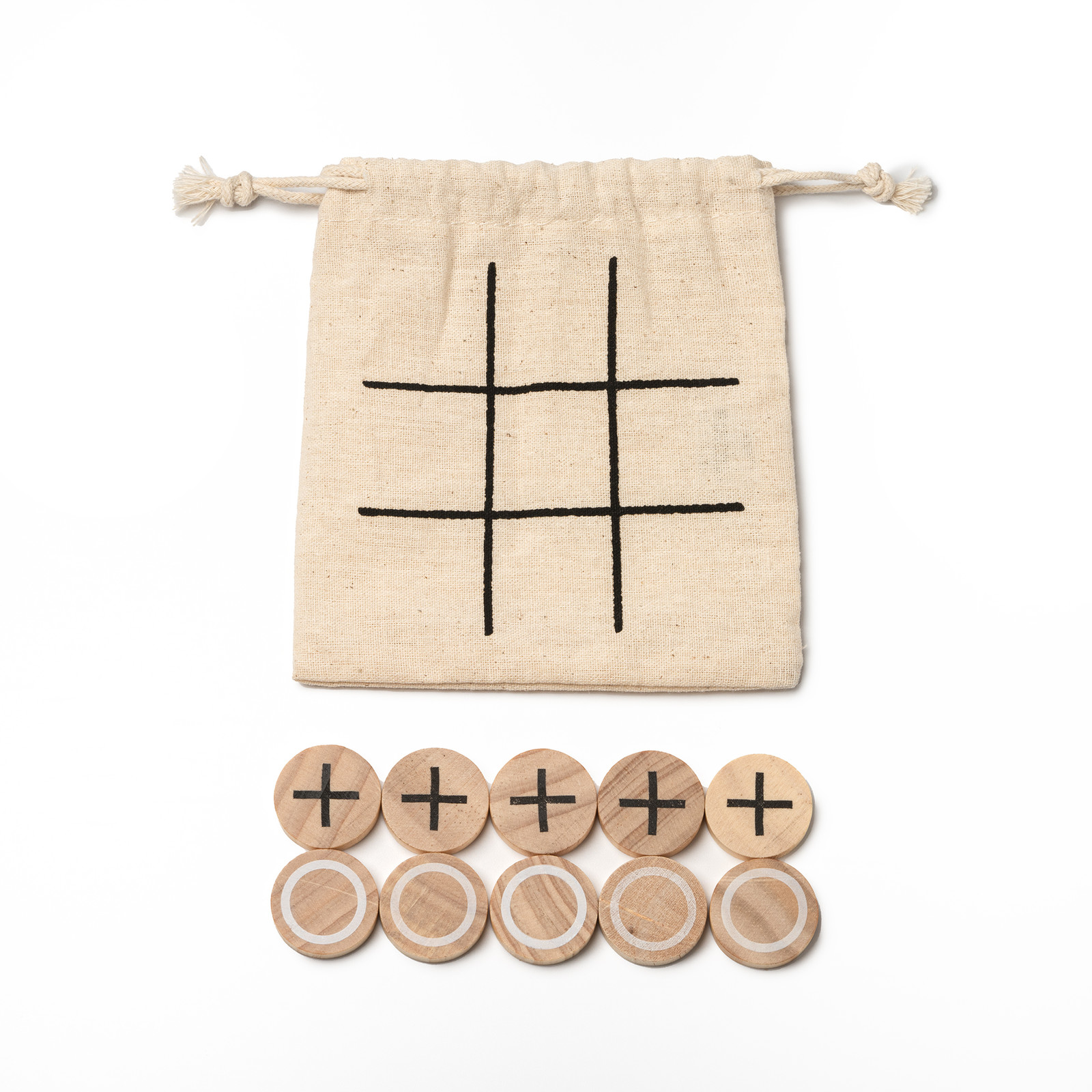 Gioco Tris include 10 pezzi in legno in sacchetto di cotone naturale. Dimensioni: cm 13x12. Imballo: 500pz
