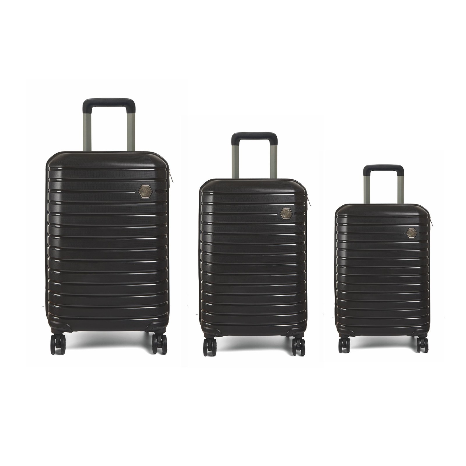 Set 3 valige da viaggio in polipropilene con 4 ruote, targhetta in metallo personalizzabile, chiusura americana, TSA lock, fodera nera interna. Dimensioni: L: cm 50x78x32 M: cm 43,5x67x31 S: cm 41x57x23.