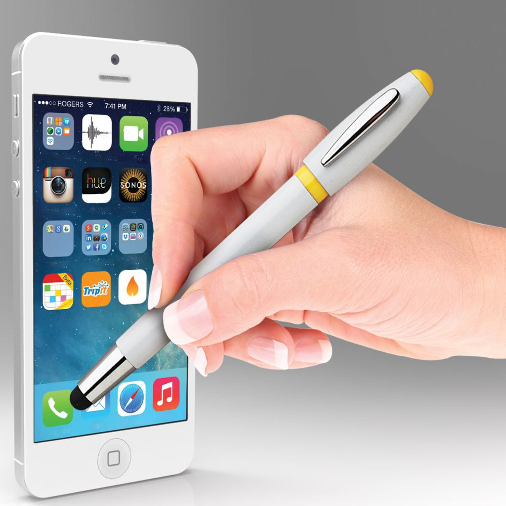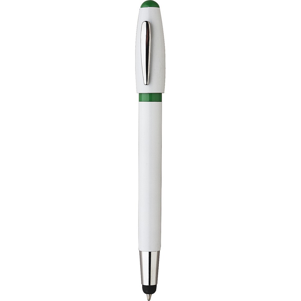 Touch pen a scatto in plastica con clip in metallo. Fusto bianco, particolari colorati. Refill nero. Colori: vedi catalogo/sito. Imballo: 1000xcolore