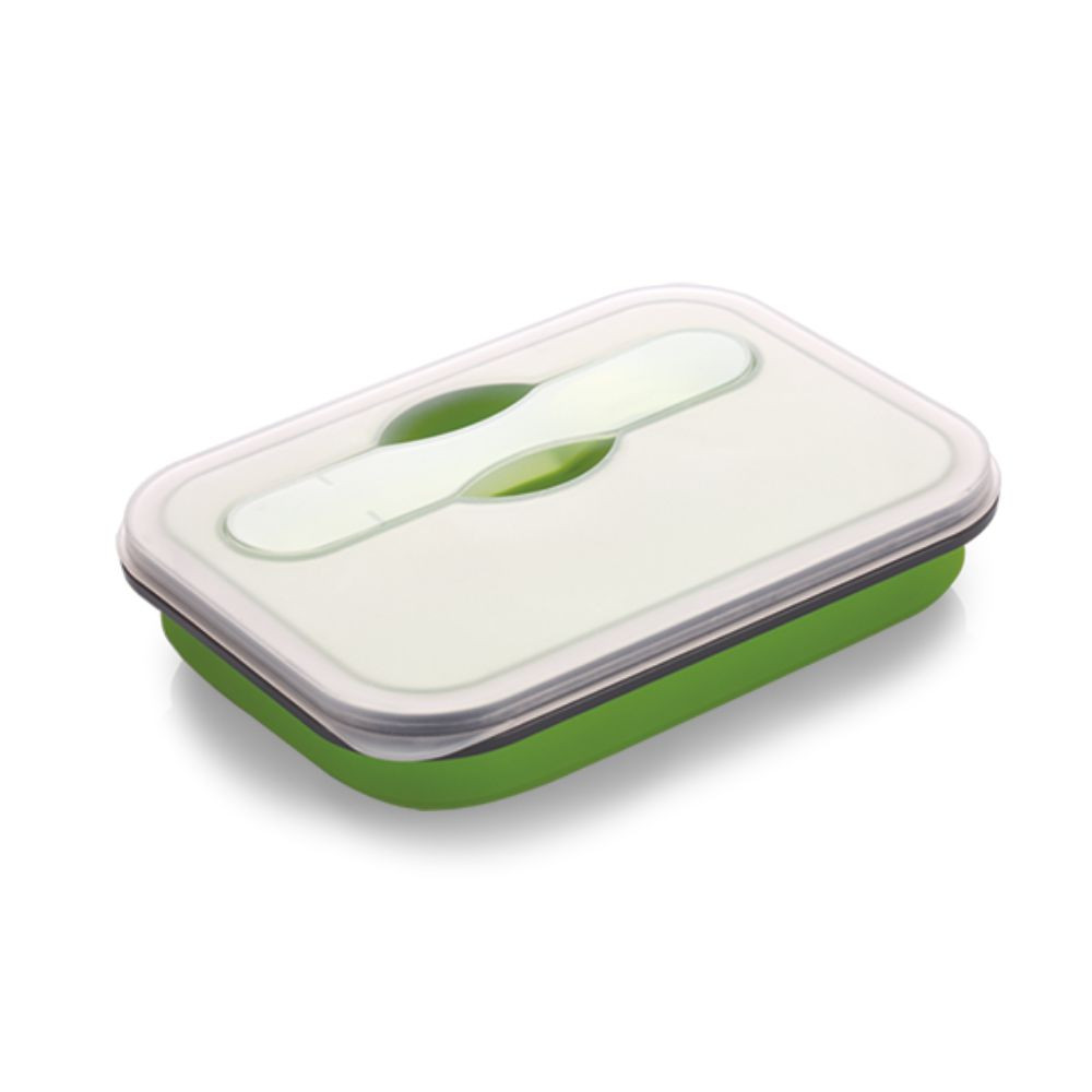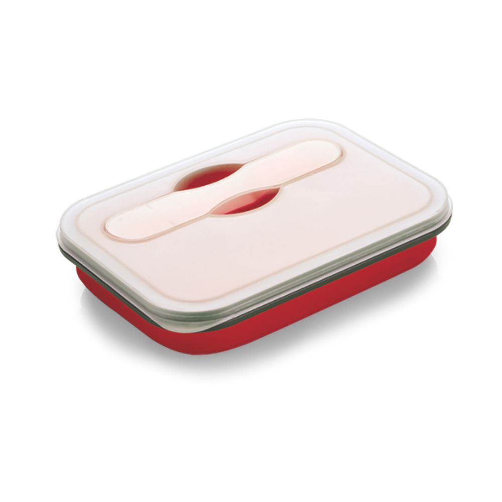 Lunch box estendibile in abs e silicone. Completo di posate. Lavabile in lavastoviglie. Colori: rosso, verde. Confezione in polybag. Dimensioni cm. 17x12,7x3/7 Imballo: 20xcolore