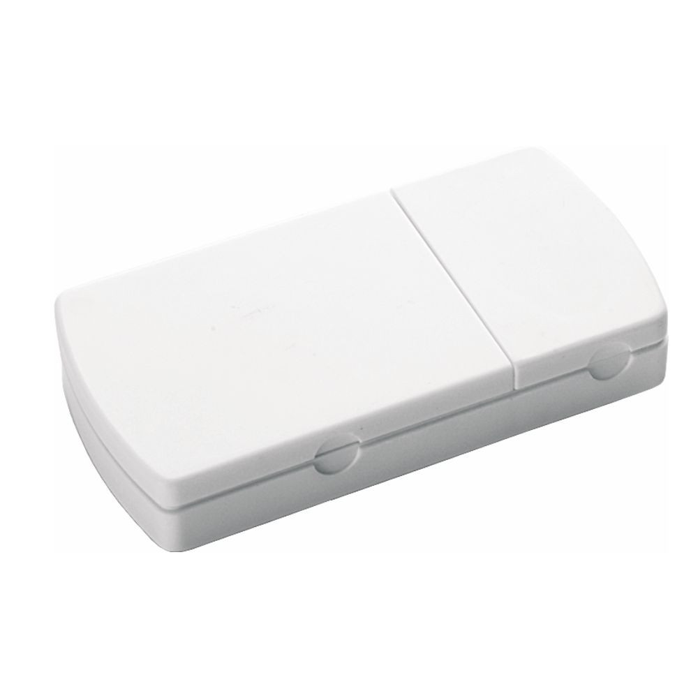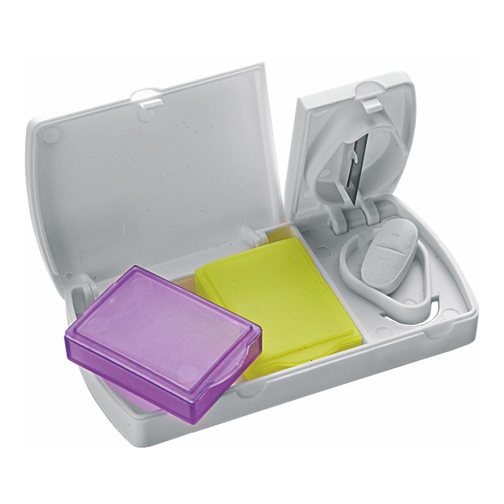 Portapillole a 2 scomparti rimovibili con tagliapillole. In plastica. Colore unico. Confezione in polybag. Dimensioni cm 5,5x9,5 x9 Imballo: 500