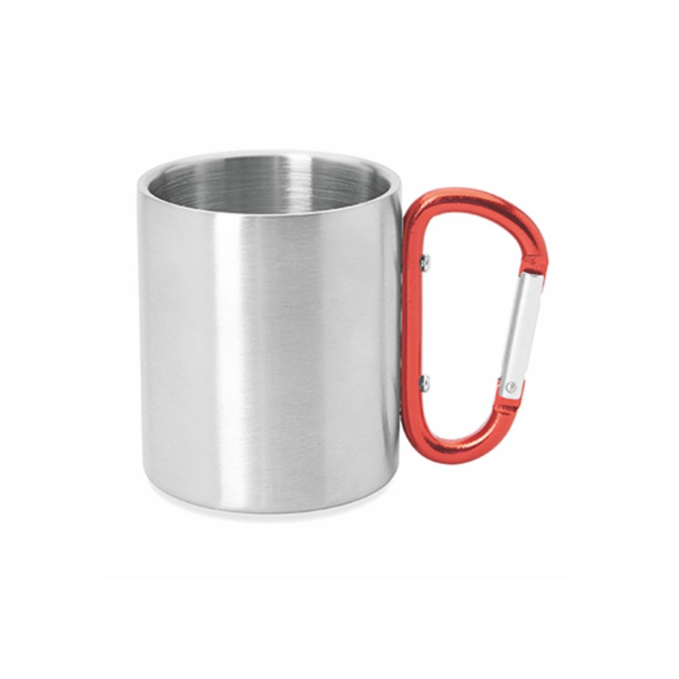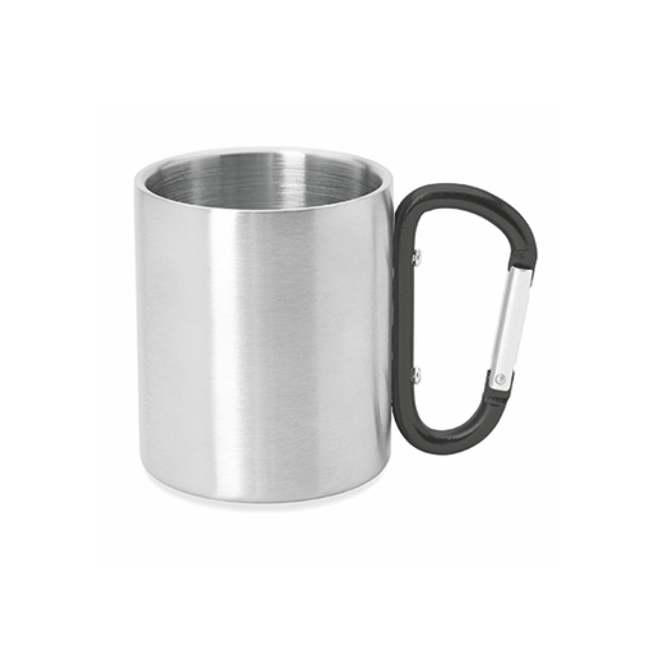 Tazza in acciaio doppia parete, impugnatura con moschettone. Dimensione: cm ø 7 H 8. Confezione: in astuccio . N.B. Per motivi logistici è necessaria la spedizione su pallet. Si consiglia l'acquisto di 150pz.