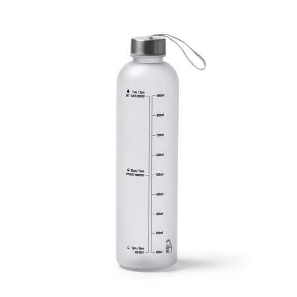 Bottiglia in tritano con corpo traslucido, tappo a vite e maniglia per il trasporto. Include raccomandazione per l'idratazione e indicatore di capacità. Capacità: 1 litro. Confezione in scatola. Dimensioni: cm 27,5x7,5Ø. Il complemento ideale per chi ama essere organizzato con stile.