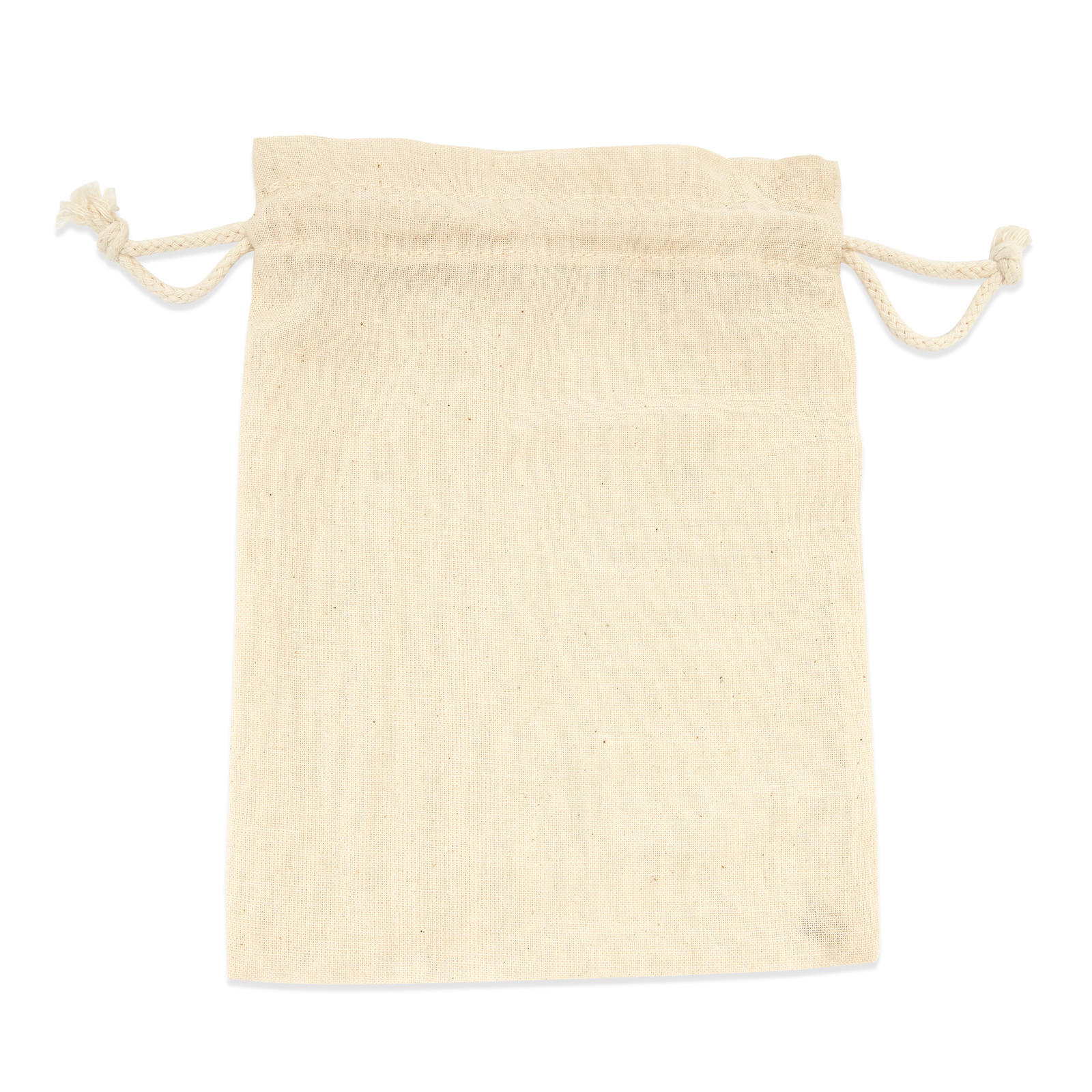 Borsa a sacco in cotone 105gr con lacci autochiudenti. Dimensioni: cm 15x21. Confezione in polybag. Imballo: 500pz.