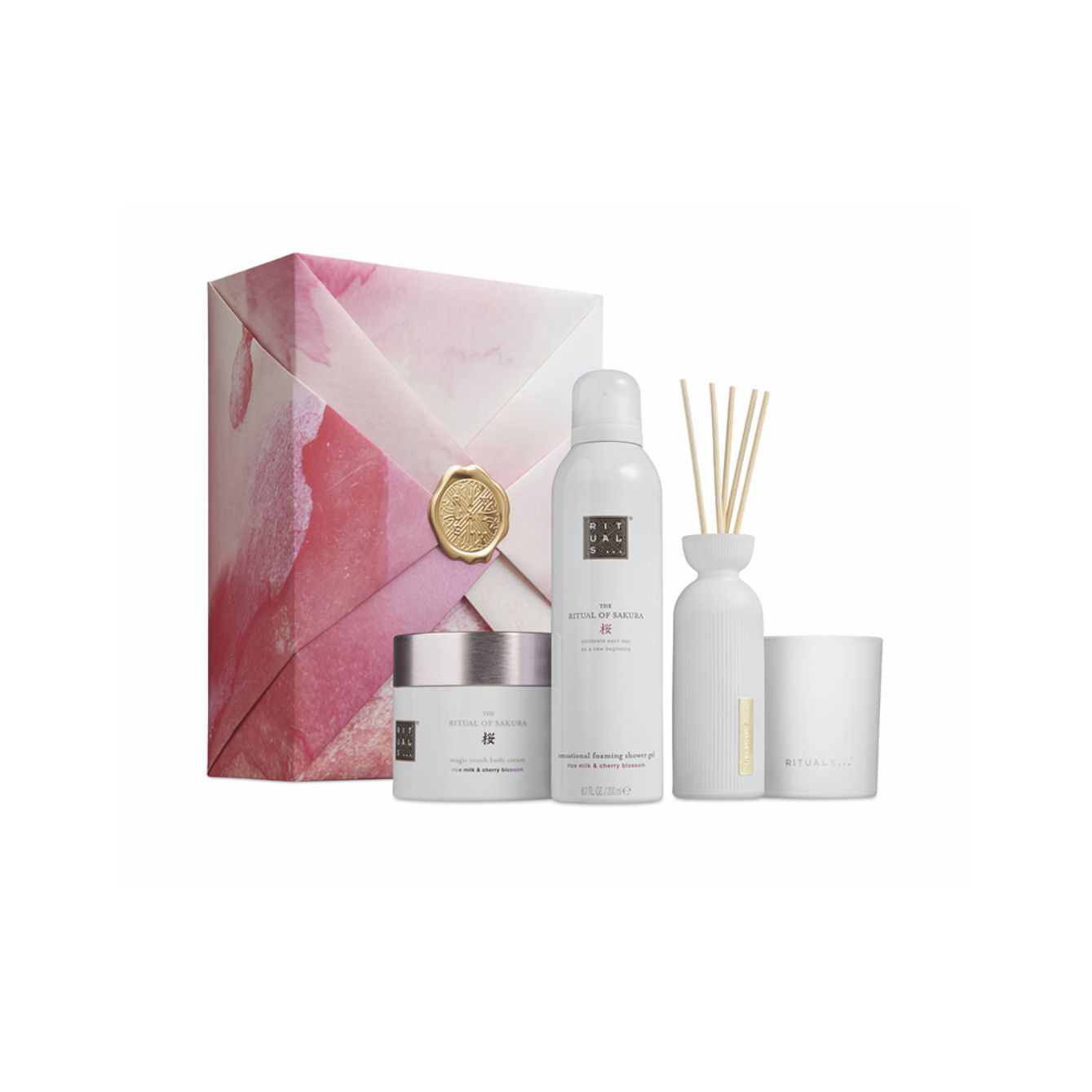 Il cofanetto Rituals Large è un'esperienza di benessere completa per coccolare corpo e mente. Include un docciaschiuma in gel, una crema corpo, una candela profumata e dei bastoncini profumati mini, tutto quello che serve per una pausa di relax perfetta. C