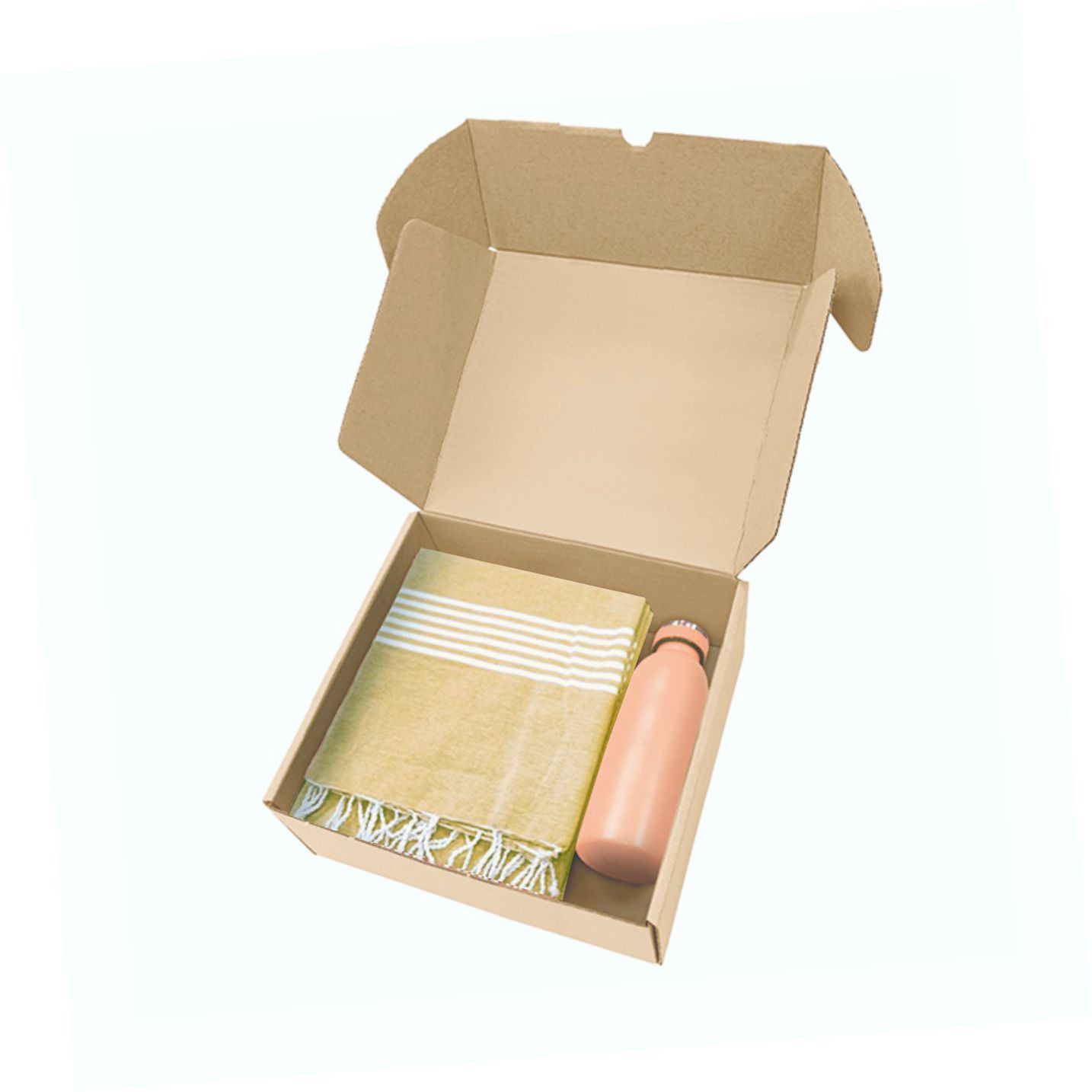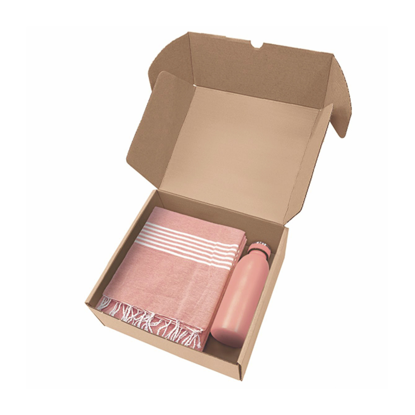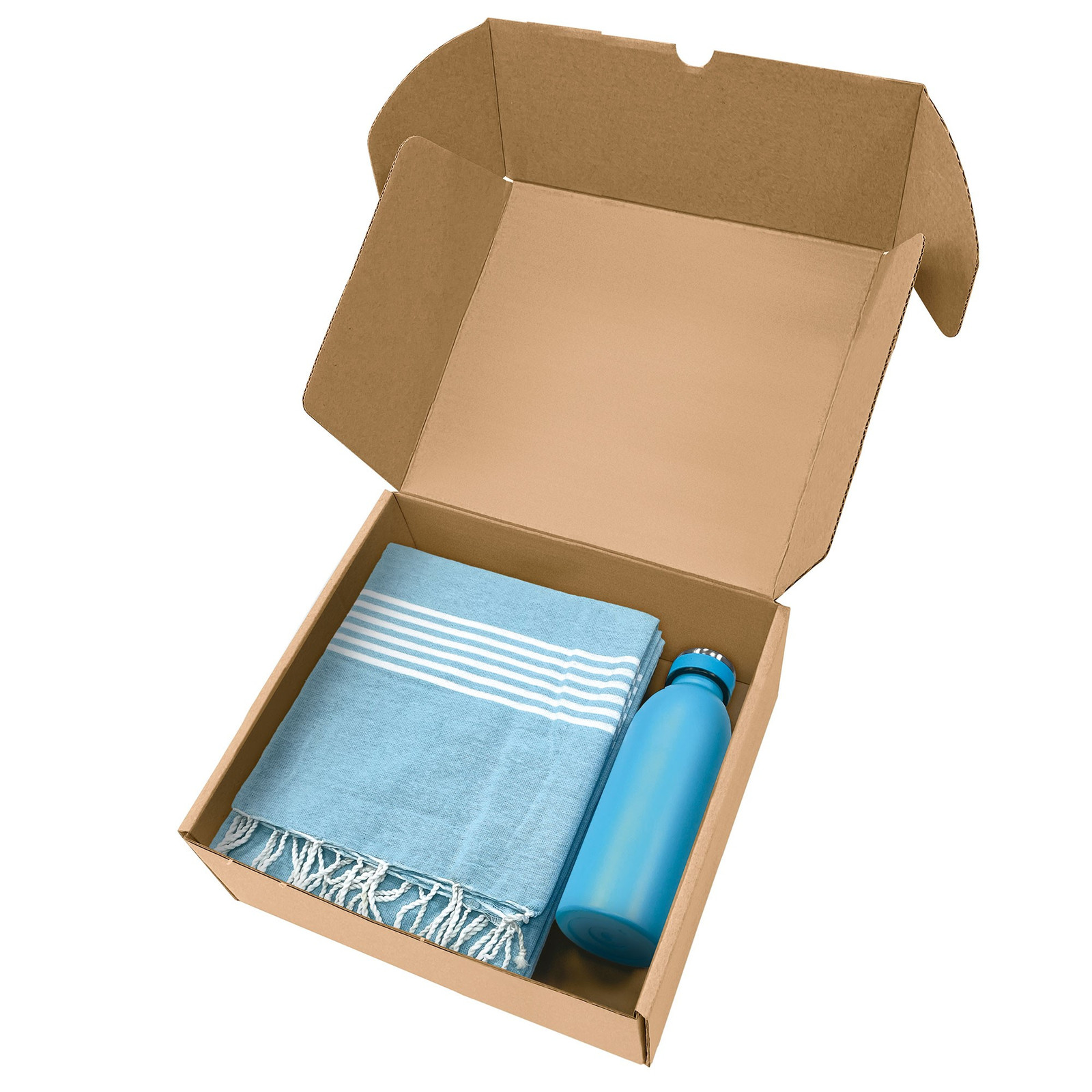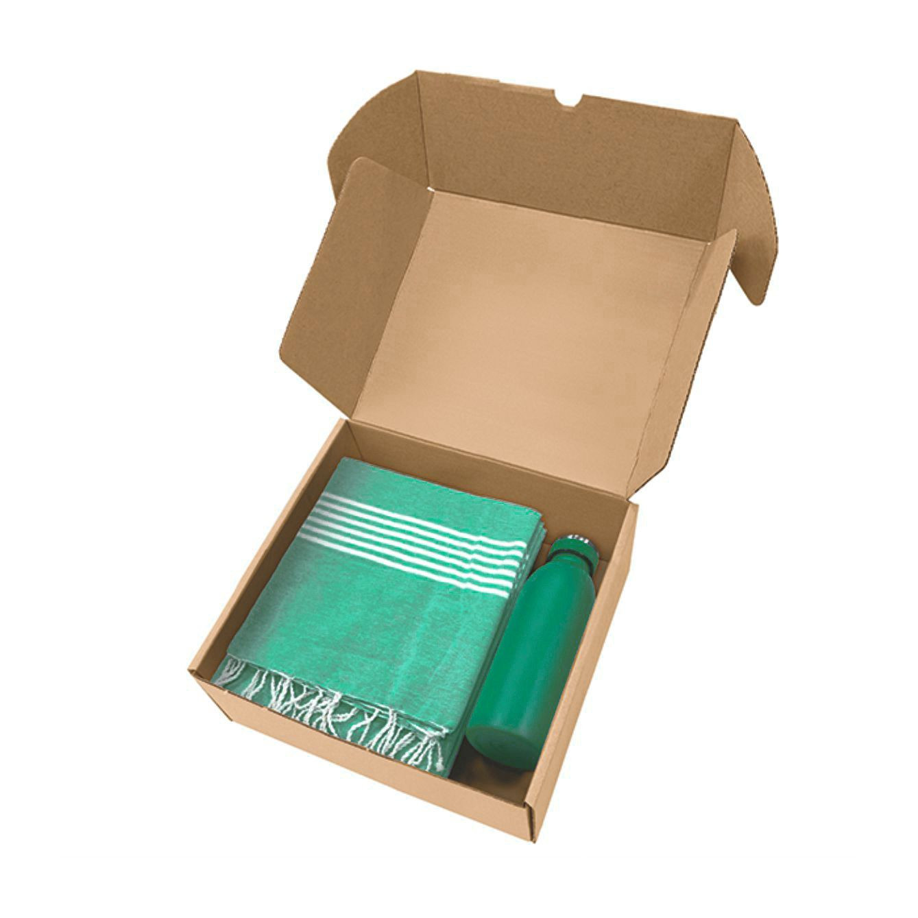 Box in cartone ondulato riciclato con all'interno art. 1093 telo mare con frange da 170 g/m² in 80% cotone e 20% poliestere e art. 8620 borraccia termica da 500ml in acciaio inox. - La confezione di presentazione è progettata per regali di 26,5x9x30 cm.