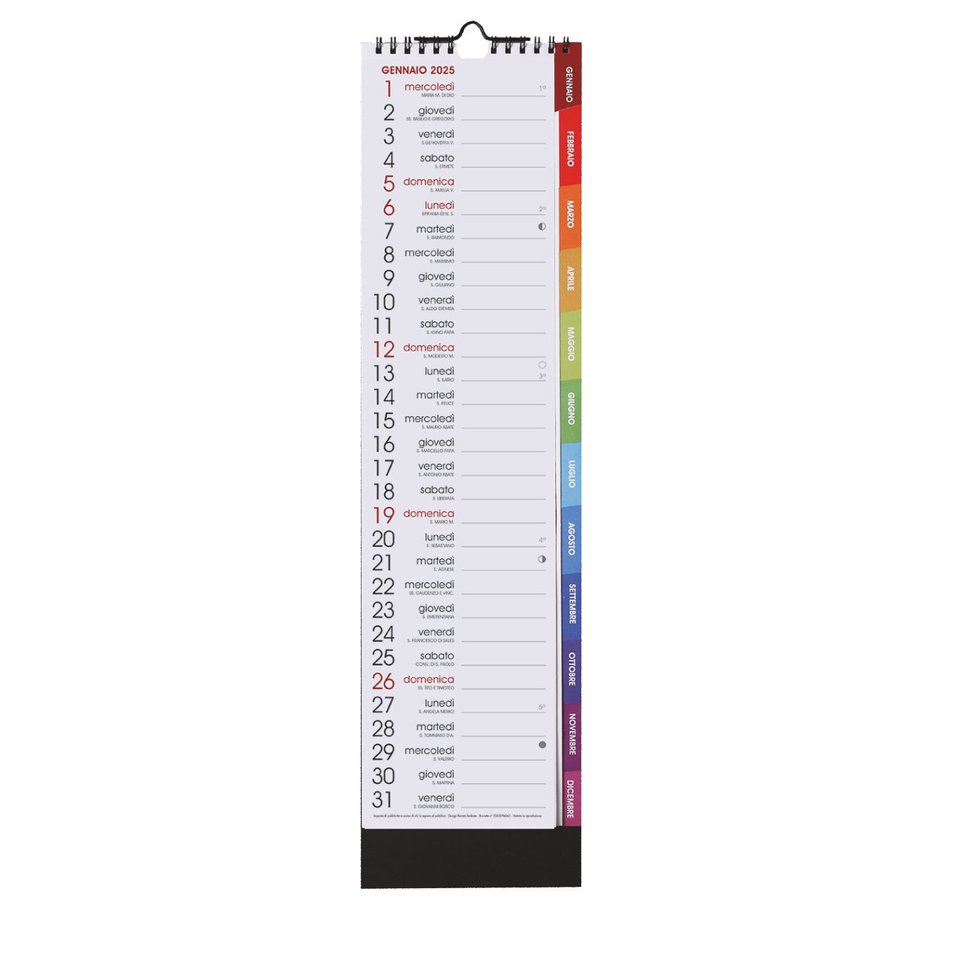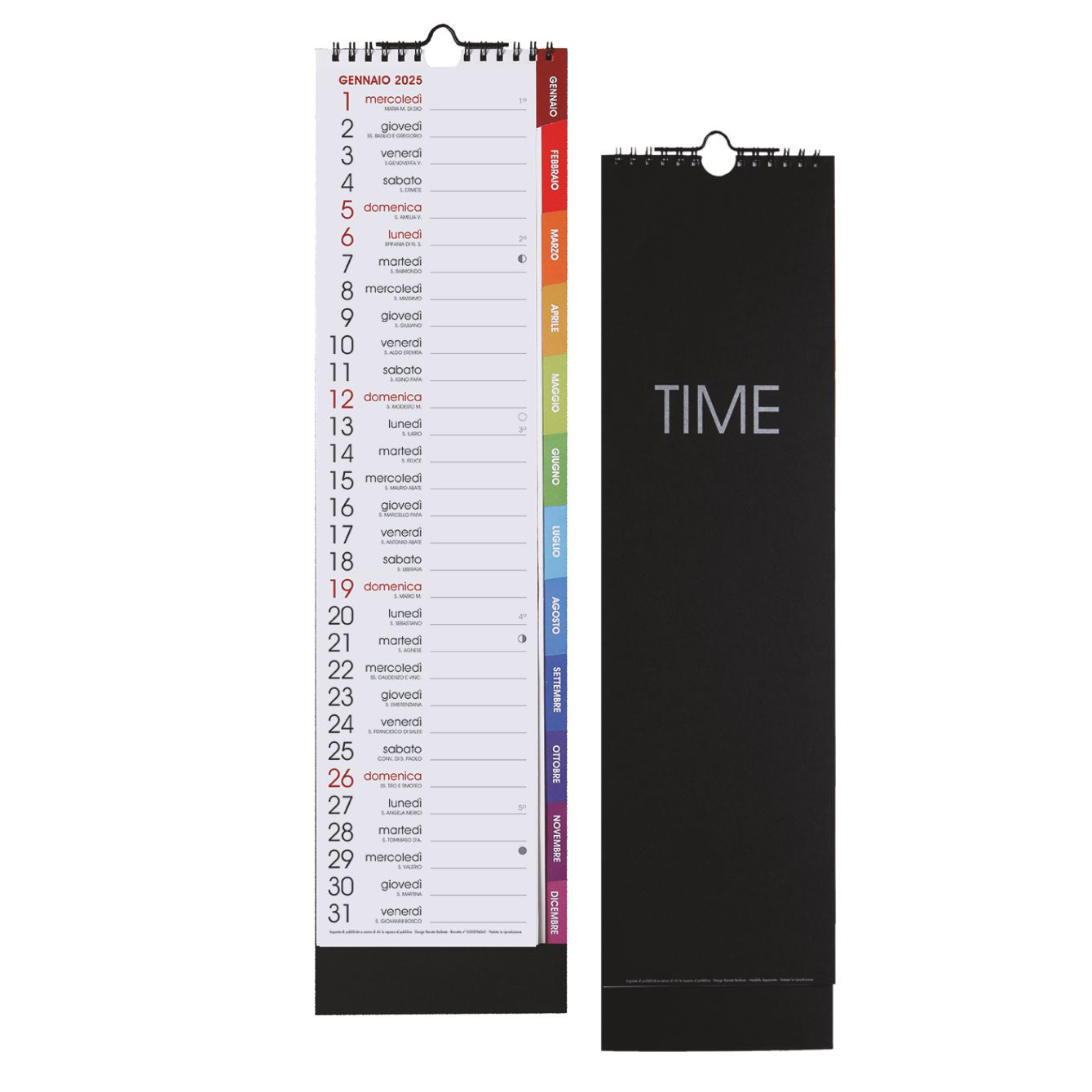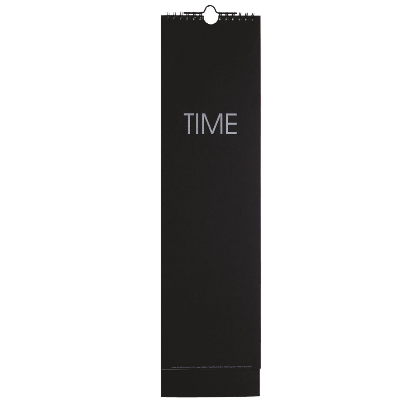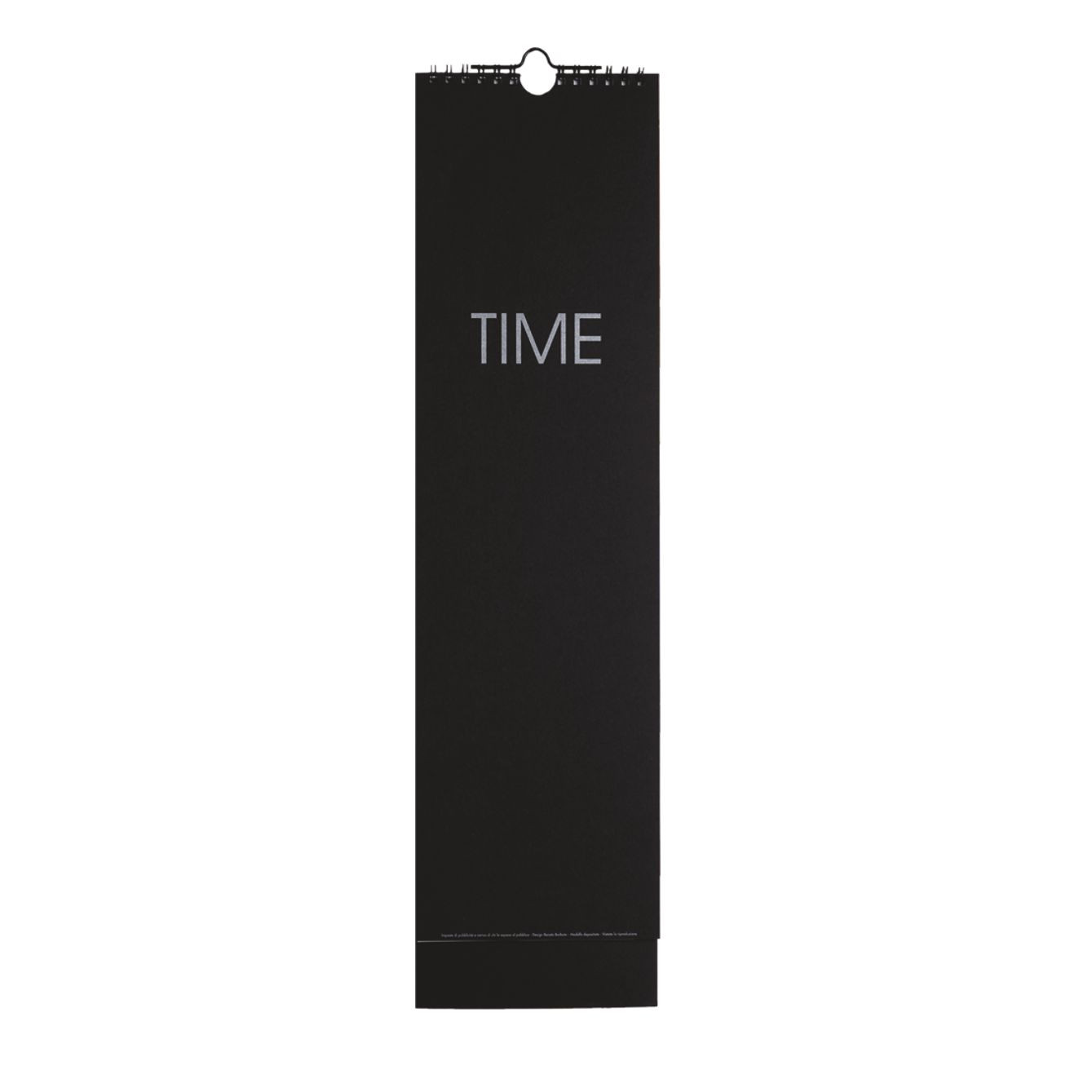 Calendario con spirale “QTIME”. Mensile 13 fogli. Dimensioni: cm 13x50, piedino cm 13x3.5. Imballo: 100. Carta Patinata . Gr. 130 mq