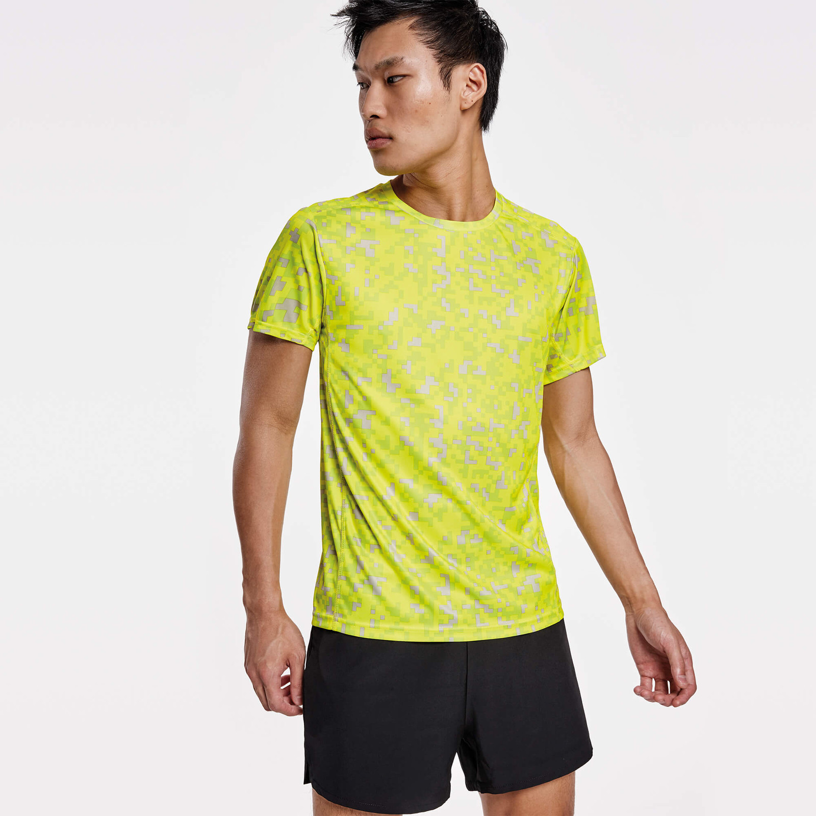 T-shirt tecnica stampata manica corta. Girocollo con copricuciture di rinforzo in contrasto nel colore giallo fluo. Pannelli laterali all´interno della manica e sulle spalle con rammagliato in tono.