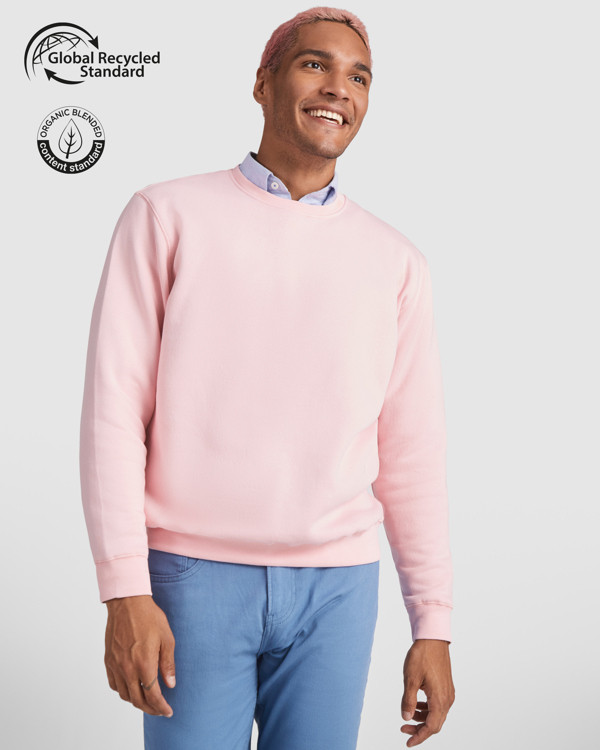 Felpa unisex in cotone organico pettinato e poliestere riciclato. Collo, polsini e girovita a costine 2x1. Cuciture ricamate su spalla, giromanica, collo, polsini e girovita. Mezzaluna all'interno della parte posteriore del collo.