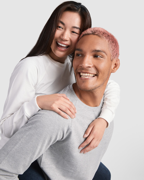 Felpa in cotone manica lunga stile ranglan. Collo, polsini e cintura in costina 2x2. Girocollo con copricuciture di rinforzo all´interno del collo. Cuciture frontali incrociate e rinforzate in costina 2x2.