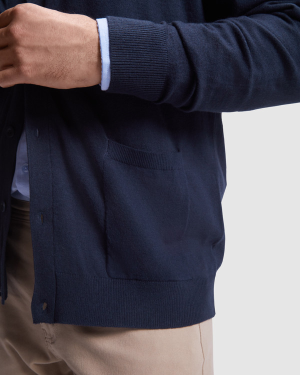 Giacca con collo a V. Tessuto a maglia morbida. Chiusura centrale di cinque bottoni in tono. Due tasche plaston. Polsini e vita elasticizzati in maglia a costine.