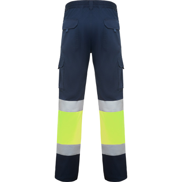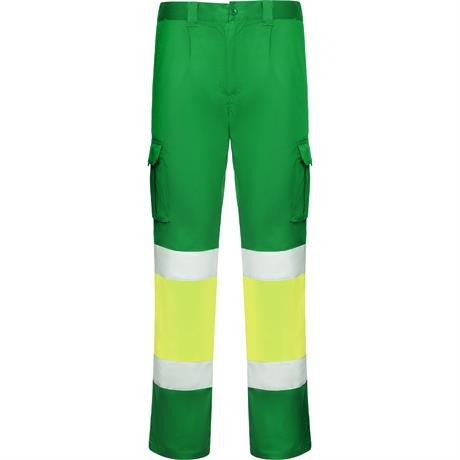 Pantalone lungo multitasche alta visibilità. - · Tessuto confortevole e flessibile. - · Vita elasticizzata regolabile sul retro. - · Due tasche anteriori. - · Due tasche posteriori con patta e chiusura in velcro. - · Due tasche laterali a soffietto con patella e chiusura in velcro. - · Bicolore e nastri riflettenti.