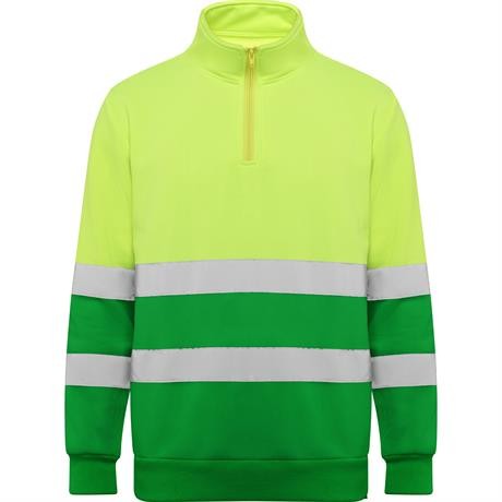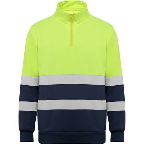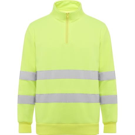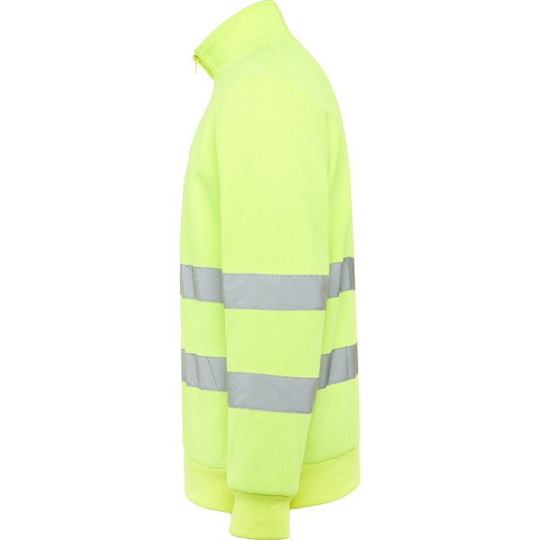 Felpa ad alta visibilità con misura della zip e collo alto con protezione per il mento e linguetta. Copertura delle cuciture rinforzata all'interno del colletto. Strisce riflettanti orizzontali su torso e maniche. costina 1x1 su polsini e orlo.
