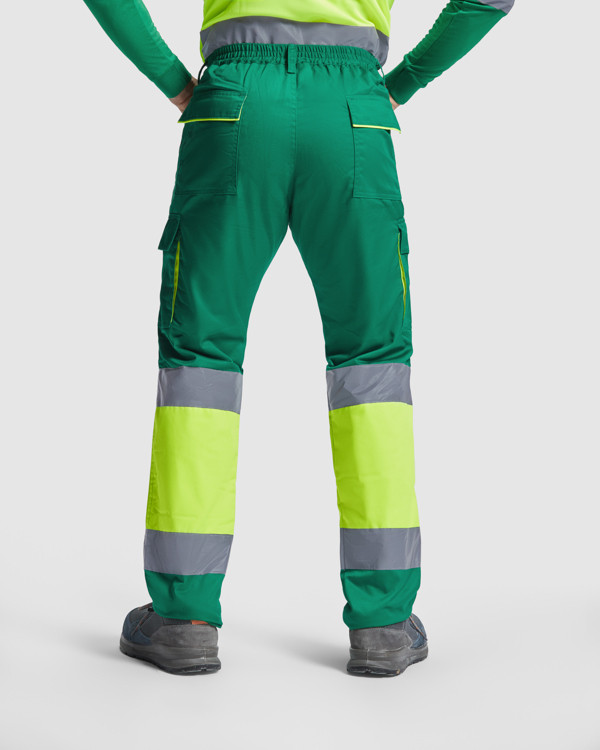 Pantaloni lunghi multitasche foderati ad alta visibilità. Combinato in due colori e nastri riflettenti. Dettagli fluorescenti a contrasto sulle tasche. Fodera interna in pile. Vita elastica regolabile sul retro. Due tasche anteriori. Due tasche posteriori con patta e chiusura a velcro. Due tasche laterali a soffietto con patta e chiusura a velcro.